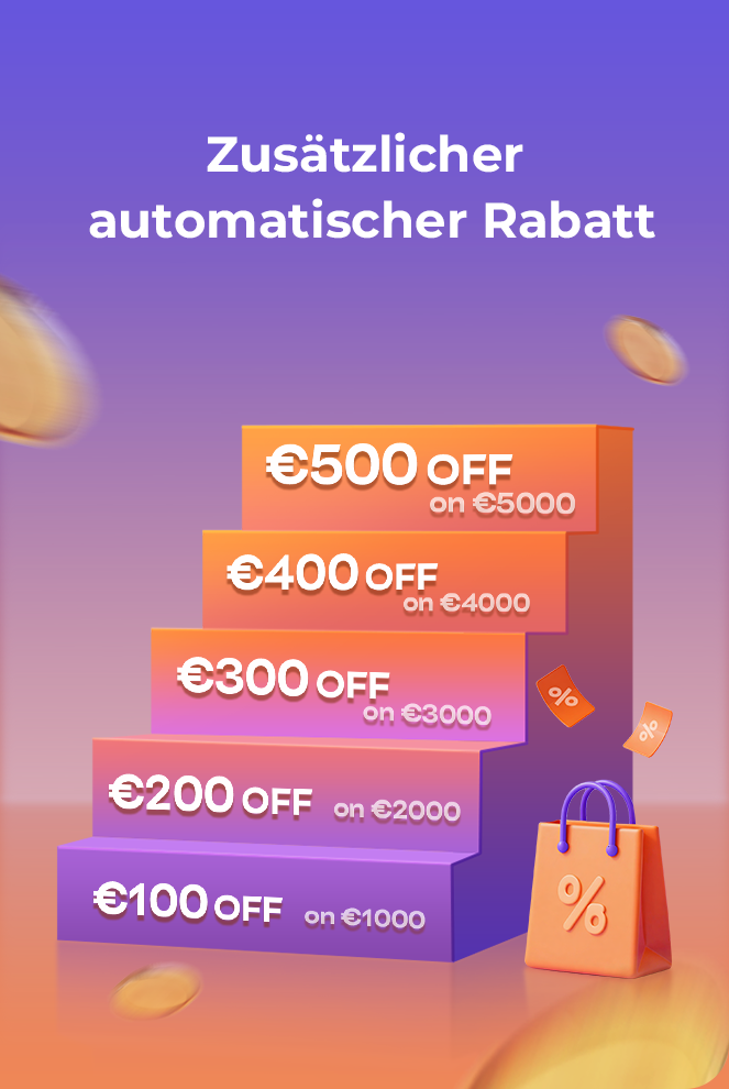 Sparen leicht gemacht! Der Rabatt wird an der Kasse automatisch basierend auf Ihrem Bestellwert abgezogen:€100 RABATT ab €1.000 | €200 RABATT ab €2000 | €300 RABATT ab €3000 | €400 RABATT ab €4000 | €500 RABATT ab €5000